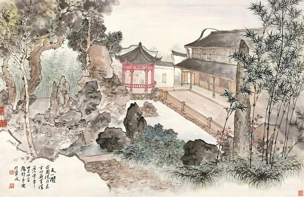 而家乡宁波,始终是他创作的灵感富矿。在宁波美术馆的展览现场,天一阁、天童寺、四明山等相关作品格外引人驻足——天一阁的黛瓦在淡彩中透着书香,天童寺的古刹隐于层林烟岚,四明山的层峦顺着笔势起伏。1960年创作的《宁波天一阁》堪称点睛之作,细腻笔触勾勒的飞檐斗拱间,既有对古建筑的敬畏,更藏着对家乡文化地标的自豪。1979年,他更专程返乡写生,走遍宁海的山山水水,那方“宁海应野平”的落款,成为作品中最温暖的印记。