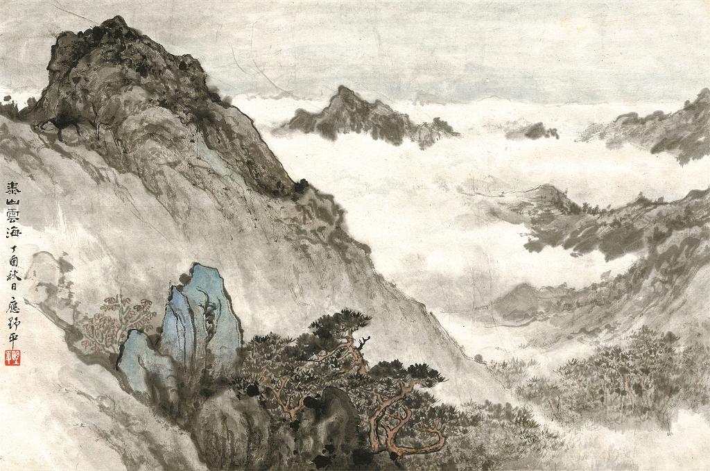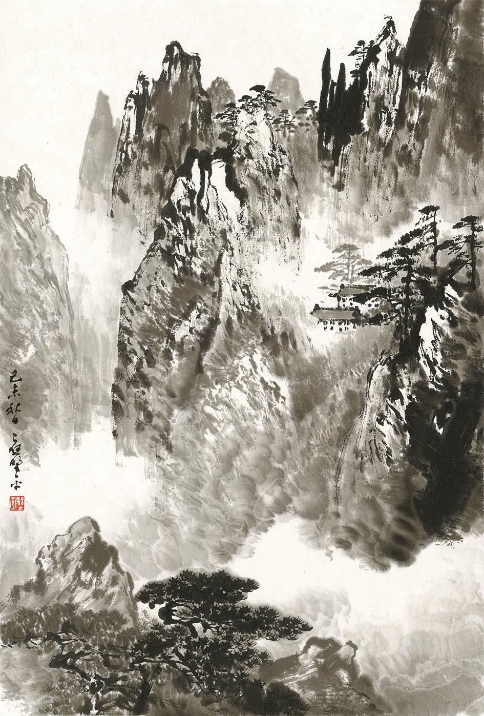 黄山是应野平晚年创作的核心题材,1977年他四上黄山,与林风眠、陆俨少等名家合作,最终形成了独树一帜的黄山画风。为了捕捉黄山云海的变幻,他凌晨3点起床,披上棉大衣爬上山顶等待日出;为了记录山石的肌理,他直接用毛笔写生,一路走一路画,还专门设计、制作了画板。在《黄山云海图》中,他独创“灰墨梯度晕染术”,以不同浓度的灰墨叠染,模拟云雾流动的厚度与光影——近处云层如浪涛翻涌却无笔痕滞碍,远处云层以淡墨勾勒似水波澜,将黄山的灵秀缥缈表现得淋漓尽致。