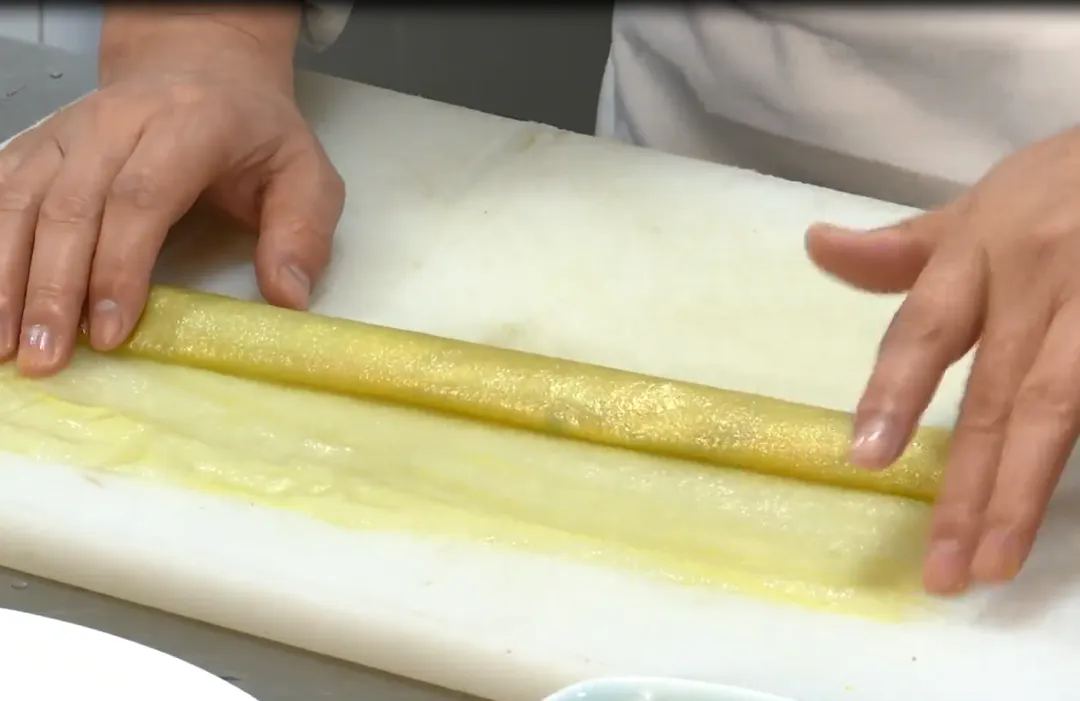 卷成宽约2.5cm的长条(约70g),蛋液封口。