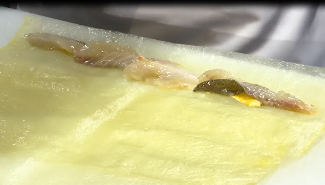把豆腐皮撕去边筋,通张摊平,两张叠放,将分好的鱼肉呈长条形排列在豆腐皮的一端。