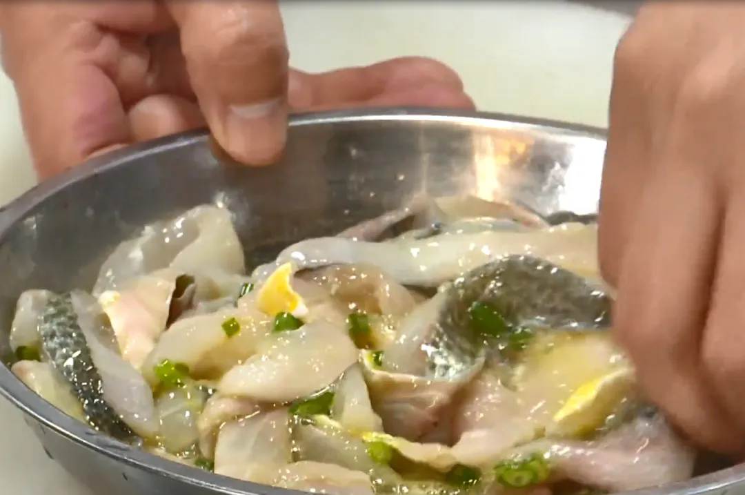 黄鱼宰杀洗净,净肉斜刀劈成约0.3cm的鱼片,放入碗中。鱼肉中加入精盐1g、味精1g、绍酒5g拌匀,再加入50g蛋液,葱花5g拌匀。