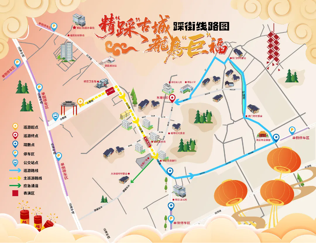 ?? 巡游路线:云衢路牌坊下(开始)→云衢路与兴巨路路口(表演点1)→兴巨路(云衢路--校场路)→兴巨路(校场路--信用社)(表演点2)→南门村→东门村→东港社区(结束点)。