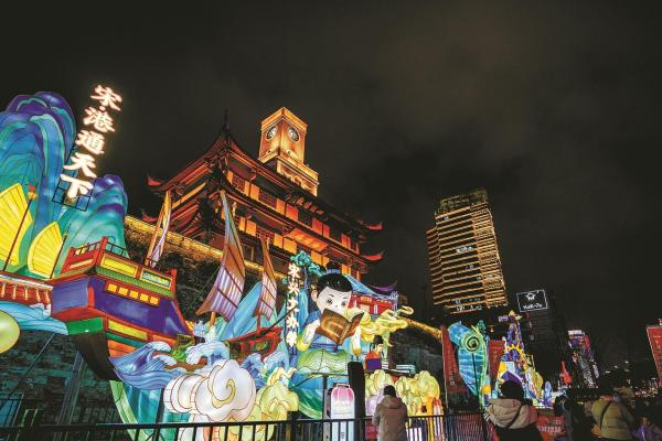 在镇海招宝山,一场名为“山海骑梦”的灯会带领游客闯入《山海经》的奇幻世界。巨大的鳌鱼灯、神兽白泽与流光溢彩的诗墙,让传统神话在夜色中“复活”,古典的浪漫随之而来。老外滩则以巨型祥灯为核心,配合网红打卡墙,走的是时尚打卡与节日祈福相结合的路子。而在慈城古县城,灯会的叙事逻辑则转向了人文与祈福。以“文曲星”为主线的近百组彩灯,点亮了千年古城的街巷,将光影艺术与“马力全开迎新年”的现代祝愿巧妙结合。海曙区同样不遑多让,罗城灯展构建起“一街一园三节点”的都市夜游体系,东渡门的“海丝扬帆”与望京门的“马到成功”灯组,将宁波的港口历史与生肖文化并置,古老的城门在流光溢彩中被重新唤醒,仿佛千年前的商船正载着满舱灯火,驶入今宵的团圆夜色。